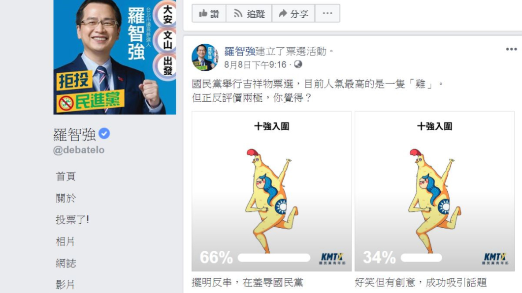 目前作品票選最高仍是這隻「金雞吉祥物」,別於過去傳統國民黨印象,引起不少人負評。對此,羅智強也在臉書粉專發起的票選活動,結果出爐:「擺明反串,在羞辱國民黨」比率達66%,較「好笑但有創意,成功吸引話題」34%大幅領先。