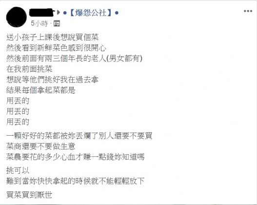 原PO表示,今(15)日早上送孩子上課後,剛好順道買菜,原本看到新鮮菜色還很開心,但前方的老人家們挑菜卻相當粗魯,「每個拿起菜都是用丟的!用丟的!用丟的!一顆好好的菜都被妳丟爛了別人還要不要買?菜商還要不要做生意?菜農要花的多少心血才賺一點錢妳知道嗎?」瞬間氣炸。
