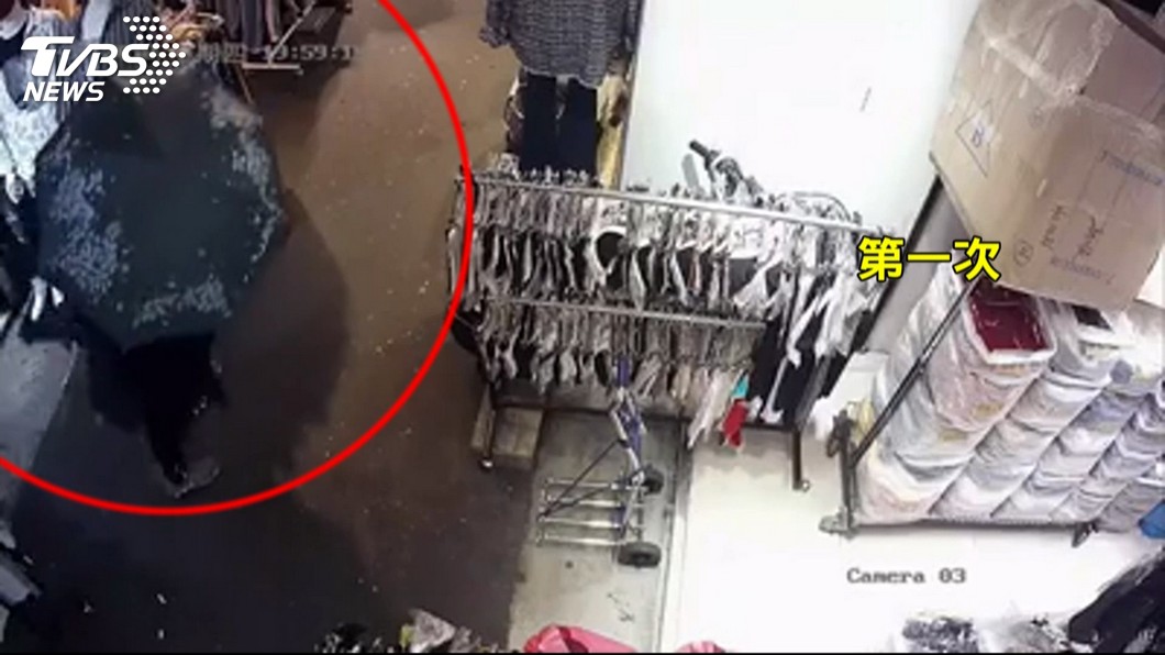 五分埔商圈店家多,竟有竊賊用雨傘擋住監視器!4日晚上八點多,一名穿著全身黑衣的女子來回在五分埔閒晃,誇張的是她還戴口罩、眼鏡,讓特徵無法清楚指認,後來她看到喜歡的衣服,居然就打開雨傘,撐著傘逛街,對著模特兒身上的外套又摸又看,趁著店員沒注意,用雨傘遮住監視器,偷了外套逃離現場。