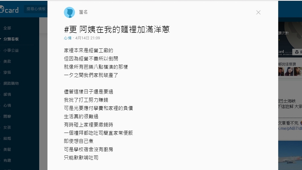 原PO得知實情後,一直向老闆娘道謝,也承諾未來出社會賺大錢,絕對會回去報答老闆娘的恩情。最後他跟室友2個人回到宿舍後,一把鼻涕一把眼淚地吃完加了滿滿洋蔥的豬排鐵板麵。